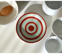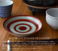 江戸後期の古伊万里を写して作った磁器の四寸皿です。水色と黒の綸線は伝統的な上絵付用の絵具が使われ、水 彩画の ように淡く透明感のある風合いが特徴です。絵付が難しいとされる赤色は、鉛成分のない安全な赤絵具を使って試作を重ね、 理想の色味に近づけました。模様入りの皿は、食卓を華やかにし、料理を引き立ててくれます。白い皿との相性の良さは もちろん、漆器や土ものの器ともよく調和します。四寸は、ちょっとしたおかずを 載せるのにちょうどよい大きさで、 取り皿としても、また果物や菓子を載せるのにもぴったりなので、毎日活躍す るサイズです。