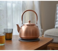 銅には抜群に優れた熱伝導性と抗菌・除菌作用や塩素を分解 する作用があり、薬缶にとても適した素材です。赤金色の真 新しい銅の肌が、使い込むほどに自然に深みのある飴色へと 落ち着いていく様子を末長くお楽しみ下さい。