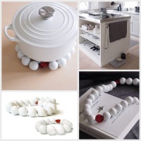 真珠のネックレスのように連なった磁器製または木製の鍋敷き。 大きな鍋の時には一連で、小さな鍋の時には2連の輪や八の字 にすることで安定感を持って使えます。 赤い部分はレザーになっ ていてこの部分でクロスさせて使います。
