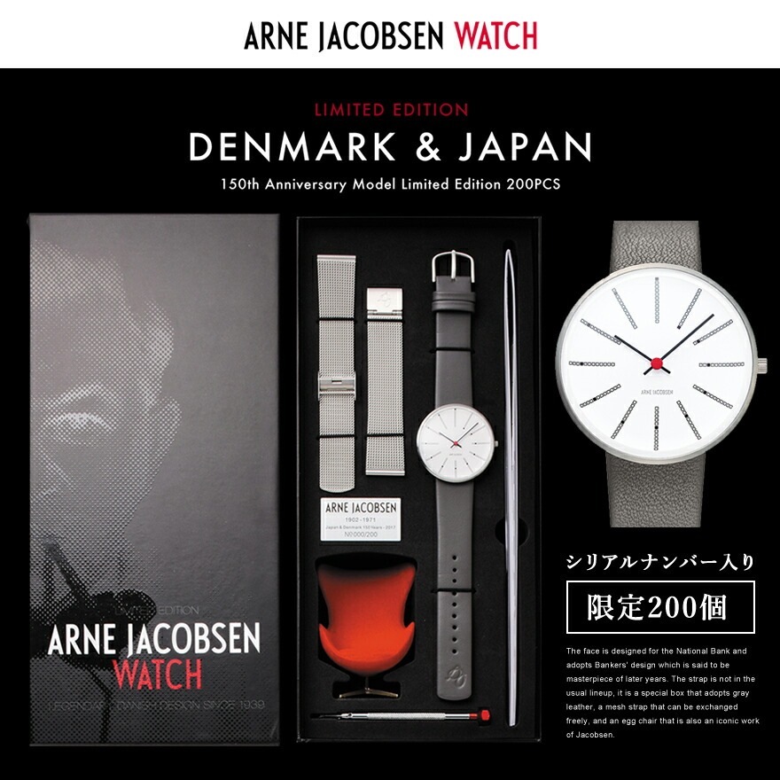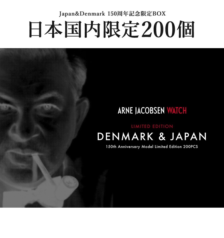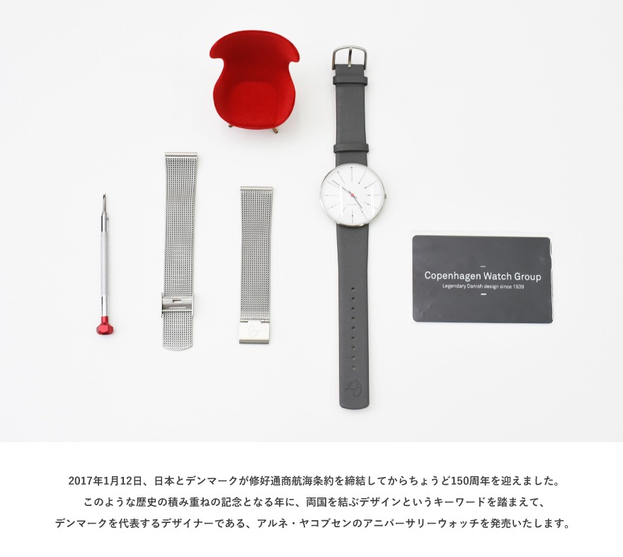 2017年1月12日、日本とデンマークが修好通商航海条約を締結してからちょうど150周年を迎えました。 このような歴史の積み重ねの記念となる年に、両国を結ぶデザインというキーワードを踏まえて、 デンマークを代表するデザイナーである、アルネ・ヤコブセンのアニバーサリーウォッチを発売いたします。