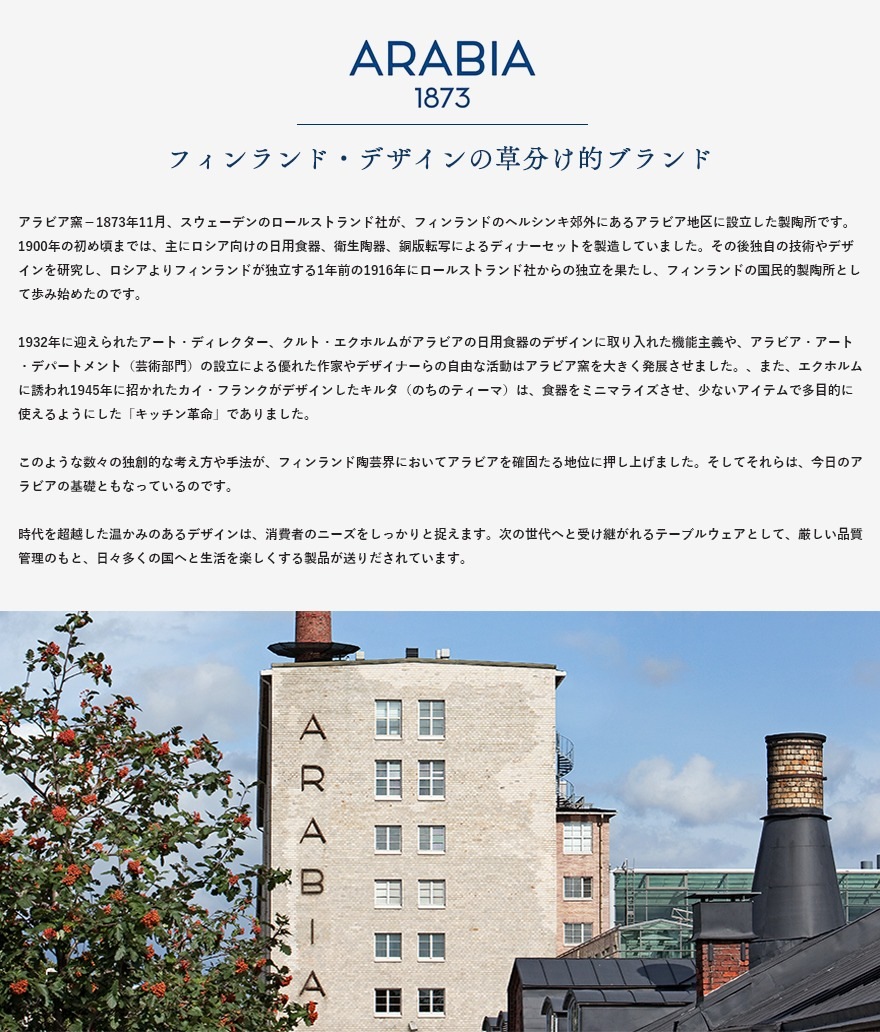 アラビア窯-1873年11月、スウェーデンのロールストランド社が、フィンランドのヘルシンキ郊外にあるアラビア地区に設立した製陶所です。1900年の初め頃までは、主にロシア向けの日用食器、衛生陶器、銅版転写によるディナーセットを製造していました。その後独自の技術やデザインを研究し、ロシアよりフィンランドが独立する1年前の1916年にロールストランド社からの独立を果たし、フィンランドの国民的製陶所として歩み始めたのです。