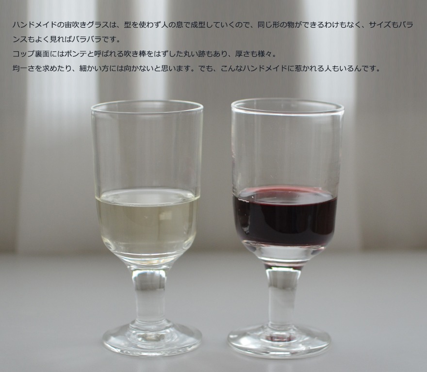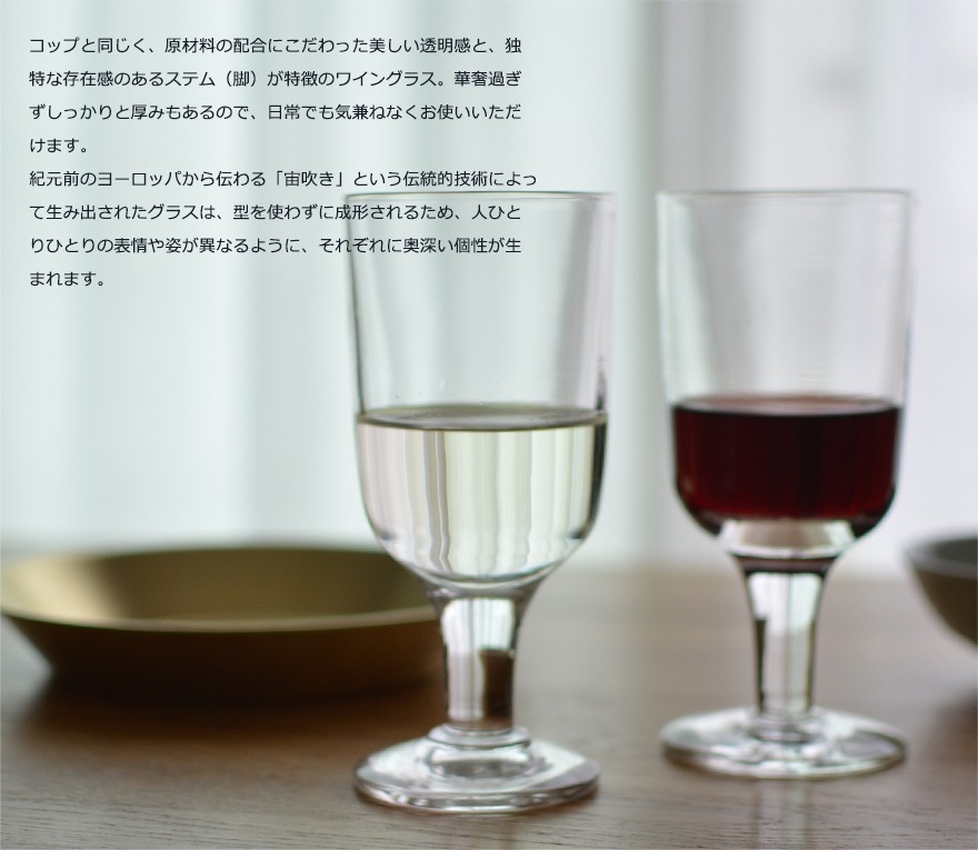 コップと同じく、原材料の配合にこだわった美しい透明感と、独特な存在感のあるステム(脚)が特徴のワイングラス。華奢過ぎずしっかりと厚みもあるので、日常でも気兼ねなくお使いいただけます。 紀元前のヨーロッパから伝わる「宙吹き」という伝統的技術によって生み出されたグラスは、型を使わずに成形されるため、人ひとりひとりの表情や姿が異なるように、それぞれに奥深い個性が生まれます。ワイン、シャンパン、ウィスキー、カクテル、ミネラルウォーターなど、ライフスタイルに合わせて様々なシーンでお使いいただけます。