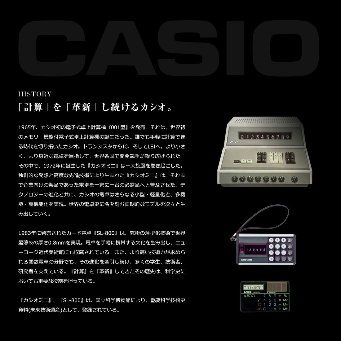 『カシオミニ』、『SL-800』は、国立科学博物館により、重要科学技術史資料(未来技術遺産)として、登録されている。
