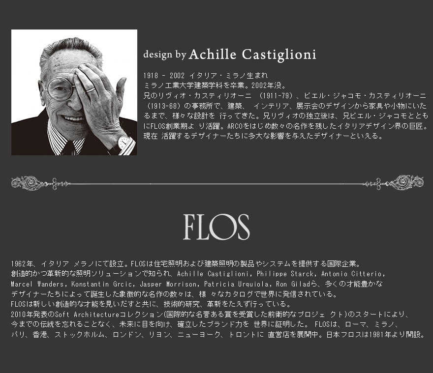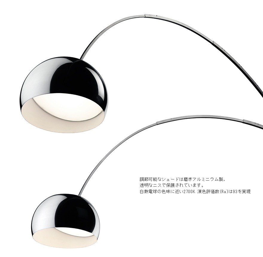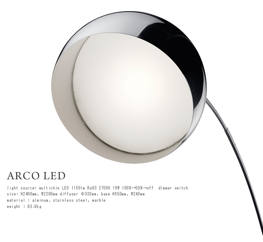 誕生から50年が経過したARCOは、同様にFLOSの歴史でもあり、FLOSは今や世界中のアイコン・デザインとなったARCOに敬意をはらうとともに、ここに50年目をむかえたARCOの新しいバージョン「ARCO LED」を発表いたします。ARCO LEDは、オリジナルデザインはそのままに、現代のニーズにあわせ光源部分のみLEDに変更しています。LEDの非常に均一で高品質な性能は、インテリアスキームを忠実に表現します。実際、演色評価数Ra(Renderingaverage)は非常に高い数値である93を実現しています。