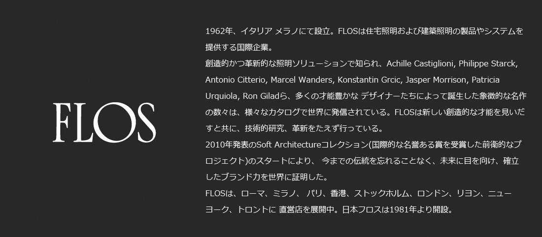 1962年、イタリア ミラノにて設立。FLOSは住宅照明および建築照明の製品やシステムを提供する国際企業。 創造的かつ革新的な照明ソリューションで知られ、Achille Castiglioni, Philippe Starck, Antonio Citterio, Marcel Wanders, Konstantin Grcic, Jasper Morrison, Patricia Urquiola, Ron Giladら、多くの才能豊かな デザイナーたちによって誕生した象徴的な名作の数々は、様々なカタログで世界に発信されている。FLOSは新しい創造的な才能を見いだすと共に、技術的研究、革新をたえず行っている。 2010年発表のSoft Architectureコレクション(国際的な名誉ある賞を受賞した前衛的なプロジェクト)のスタートにより、 今までの伝統を忘れることなく、未来に目を向け、確立したブランド力を世界に証明した。 FLOSは、ローマ、ミラノ、 パリ、香港、ストックホルム、ロンドン、リヨン、ニューヨーク、トロントに 直営店を展開中。日本フロスは1981年より開設。