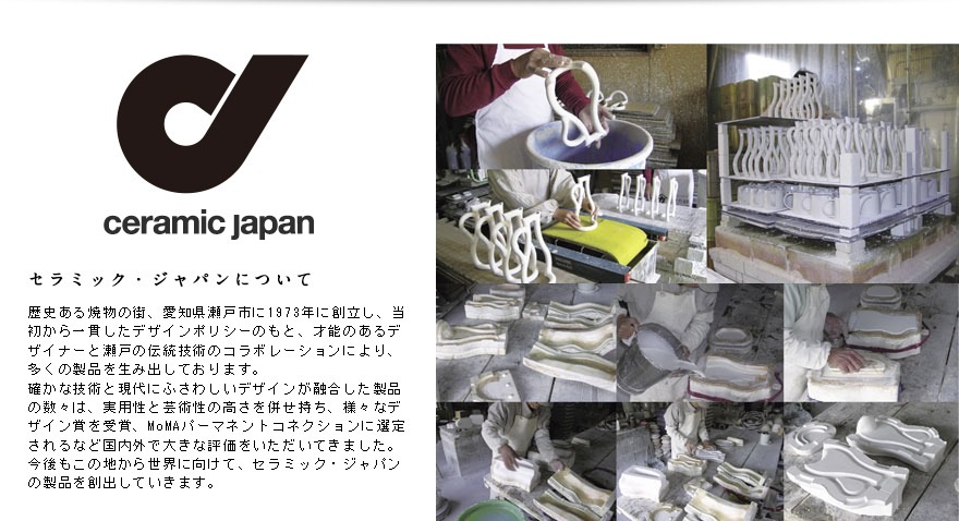 歴史ある焼物の街、愛知県瀬戸市に1973年に創立し、当初から一貫したデザインポリシーのもと、才能のあるデザイナーと瀬戸の伝統技術のコラボレーションにより、多くの製品を生み出しております。 確かな技術と現代にふさわしいデザインが融合した製品の数々は、実用性と芸術性の高さを併せ持ち、様々なデザイン賞を受賞、MoMAパーマネントコネクションに選定されるなど国内外で大きな評価をいただいてきました。 今後もこの地から世界に向けて、セラミック・ジャパンの製品を創出していきます。
