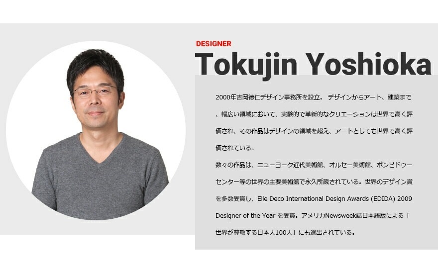 日本人デザイナーの吉岡徳仁氏が宇宙に浮かぶ惑星をイメージしてデザインしました。クリスタルガラスのように透明な樹脂の厚みを巧みに調整することによって、様々な角度からみて、美しく変化するきらめきを実現しました。