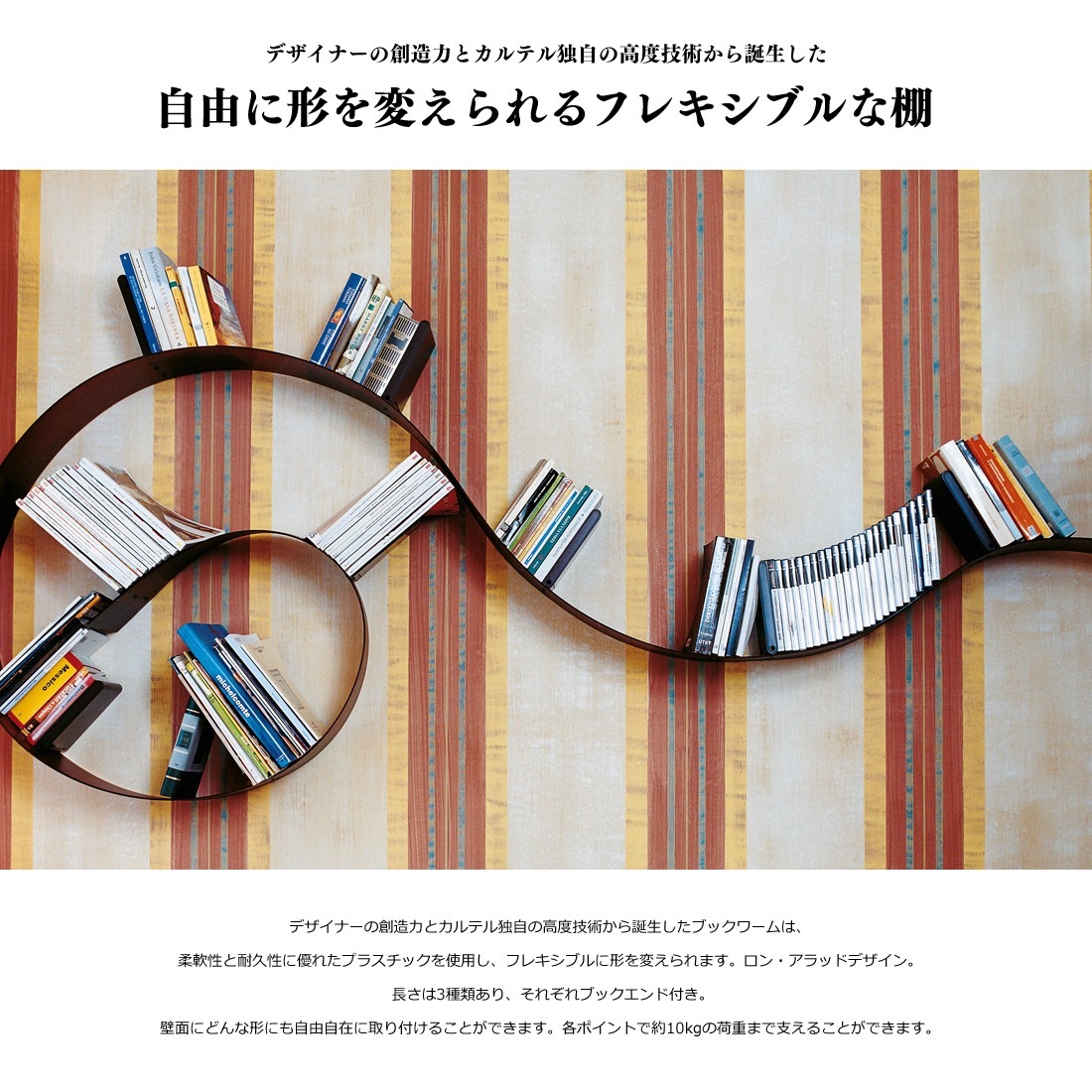 デザイナーの創造力とカルテル独自の高度技術から誕生したブックワームは、柔軟性と耐久性に優れたプラスチックを使用し、フレキシブルに形を変えられます。ロン・アラッドデザイン。 長さは3種類あり、それぞれブックエンド付き。壁面にどんな形にも自由自在に取り付けることができます。