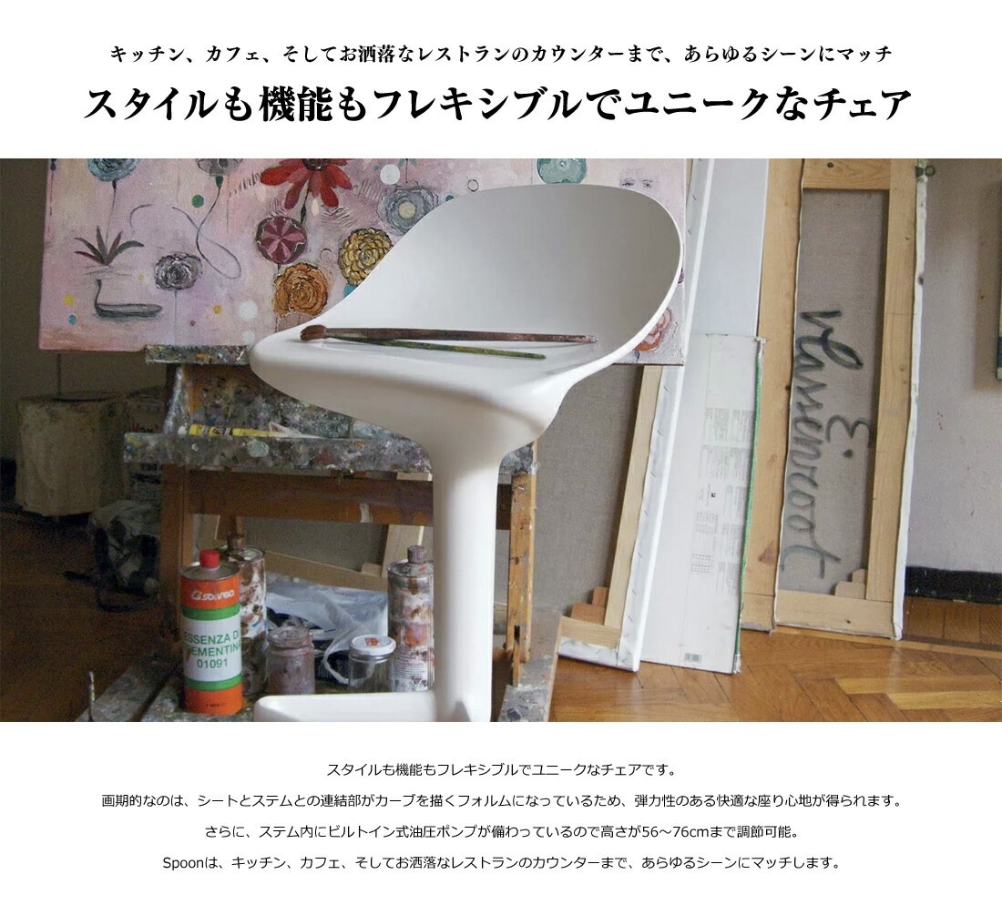 さらに、ステム内にビルトイン式油圧ポンプが備わっているので高さが56Spoonは、キッチン、カフェ、そしてお洒落なレストランのカウンターまで、あらゆるシーンにマッチします。