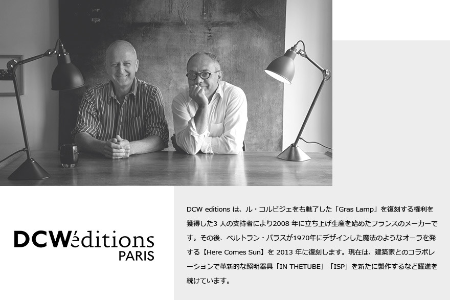 DCW コレクションのストーリーは、世界のモダンデザインの歴史のなかでも特筆すべきものとして語られます。そのコレクションは、Bernard- Albin Grasが、オフィス用、産業用のランプのシリーズをデザインした1921年にさかのぼります。そのシリーズは、「The Lampe Gras」と名づけられました。それはシンプルかつ人間工学にもとづいたデザインで、時代を先取りしていました。さらに、ランプには一切のビスも溶接も用いていません。1920年代以降、デザインと構造は徐々に進化していきました。ランプは多くの異なる業種のカスタマーに愛されましたが、そのうちのひとりに、20世紀の建築の巨匠、ル・コルビュジエがいます。コルビュジエは自身のオフィスで使うばかりでなく、彼が手がける世界中のプロジェクトで採用しました。また、アーティストのソニア・ドローネやジョルジュ・ブラックのスタジオでも使用されていました。
