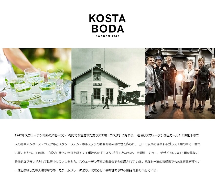 2017年コスタ ボダは設立275周年を迎えました。 そこで275周年を記念して、コスタ ボダが誇る不変のデザイン【LIMELIGHT】を復刻させました。 世界中のコスタ ボダファンが待ちに待った復刻のシリーズです。 底面にちりばめた小さな粒がまるで宝石のように輝き、優美な印象を与えます。 コスタ ボダならではの魅力を存分に感じていただけるシリーズです。すっぽりと手に収まる手軽なサイズ。底面の厚み約7~10mmなので、適度な重さがあり、高級感もあります。ストレートに近いフォルムでソフトドリンク、お酒はもちろん、スティック野菜やデザートなど、お料理の器としてもお使いいただけます。