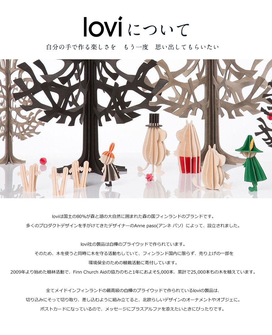loviは国土の80%が森と湖の大自然に囲まれた森の国フィンランドのブランドです。多くのプロダクトデザインを手がけてきたデザイナーのAnne paso(アンネ パソ)によって、設立されました。lovi社の製品は白樺のプライウッドで作られています。そのため、木を使うと同時に木を守る活動もしていて、フィンランド国内に限らず、売り上げの一部を環境保全のための植栽活動に寄付しています。2009年より始めた植林活動で、Finn Church Aidの協力のもと1年におよそ5,000本、累計で25,000本もの木を植えています。