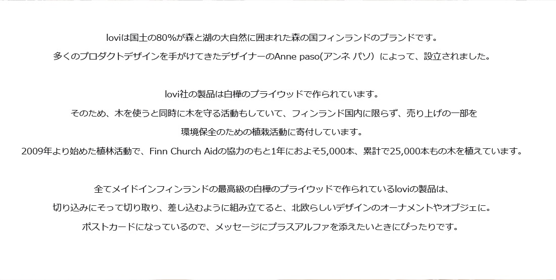loviは国土の80%が森と湖の大自然に囲まれた森の国フィンランドのブランドです。多くのプロダクトデザインを手がけてきたデザイナーのAnne paso(アンネ パソ)によって、設立されました。lovi社の製品は白樺のプライウッドで作られています。そのため、木を使うと同時に木を守る活動もしていて、フィンランド国内に限らず、売り上げの一部を環境保全のための植栽活動に寄付しています。2009年より始めた植林活動で、Finn Church Aidの協力のもと1年におよそ5,000本、累計で25,000本もの木を植えています。