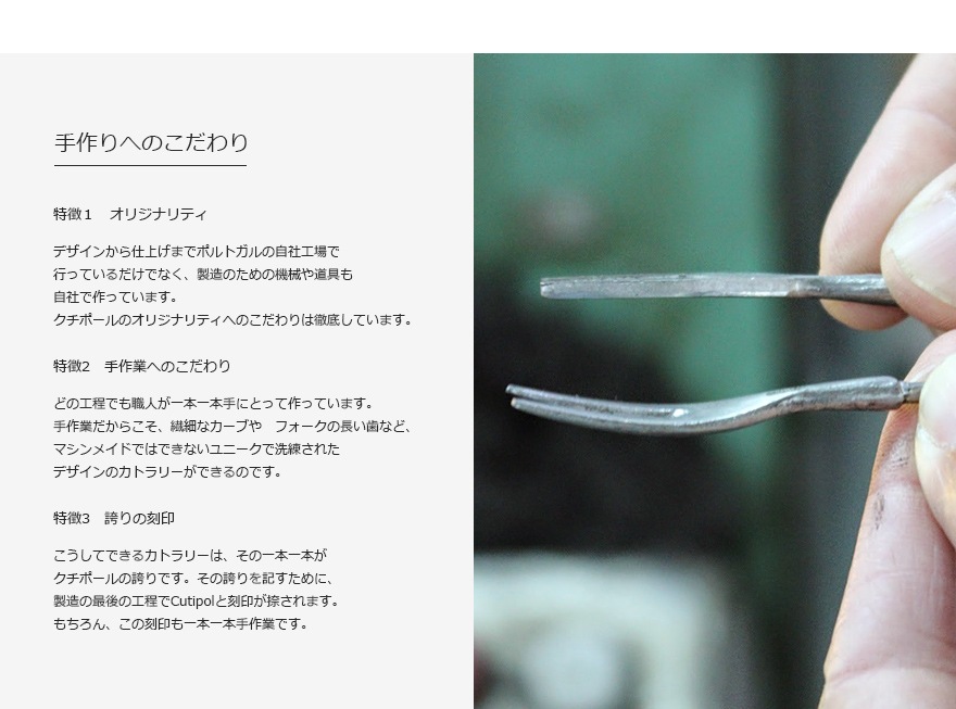 クチポール社のどの製品も、成形や蒸着の機器までを自社で考案するほど、オリジナリティを重視して作られています。もちろん、デザインや仕上げまで全工程を自社で行っています。どの工程でも熟練した職人が一本一本手にとり、丁寧に作っている製品ですので、職人の手ならではの曲線や光沢をお楽しみ頂けます。どうぞすべてのシリーズをご覧になってください。このようにして生み出されるシリーズは、伝統的なデザインから現代的なデザインまで幅広く展開されていますので、様々な文化背景を持つみなさまのお好みに合うものがきっと見つかるはずです。