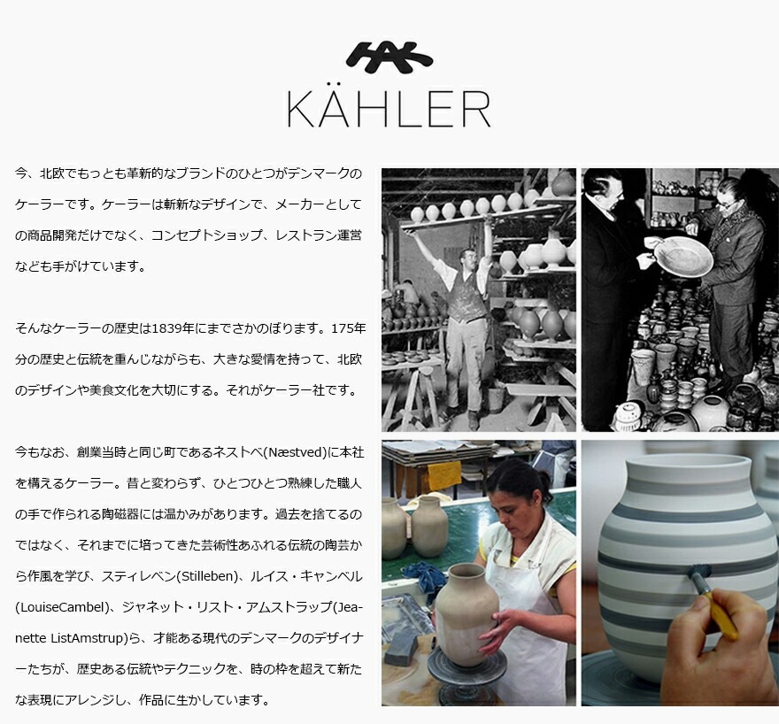 今、北欧でもっとも革新的なブランドのひとつがデンマークの ケーラーです。ケーラーは斬新なデザインで、メーカーとして の商品開発だけでなく、コンセプトショップ、レストラン運営 なども手がけています。そんなケーラーの歴史は1839年にまで さかのぼります。 175年分の歴史と伝統を重んじながらも、大きな愛情を持って、 北欧のデザインや美食文化を大切にする。それがケーラー社です。 今もなお、創業当時と同じ町であるネストベ(Næstved)に本社を 構えるケーラー。昔と変わらず、ひとつひとつ熟練した職人の手 で作ら れる陶磁器には温かみがあります。過去を捨てるのではなく、 それまでに培ってきた芸術性あふれる伝統の陶芸から作風を学び、スティ レベン(Stilleben)、ルイス・キャンベル(Louise Cambel)、 ジャネット・リスト・アムストラップ(Jeanette List Amstrup) ら、才能あ る現代のデンマークのデザイナーたちが、歴史ある伝統やテク ニックを、時の枠を超えて新たな表現にアレンジし、作品に生か しています。