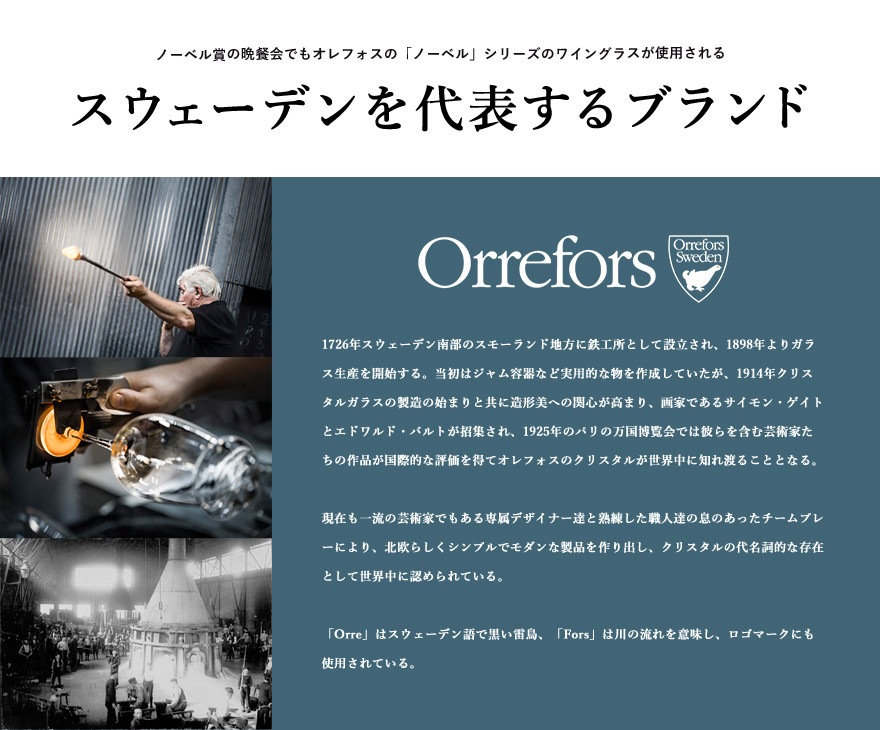 1726年スウェーデン南部のスモーランド地方に鉄工所として設立され、1898年よりガラス生産を開始する。当初はジャム容器など実用的な物を作成していたが、1914年クリスタルガラスの製造の始まりと共に造形美への関心が高まり、画家であるサイモン・ゲイトとエドワルド・バルトが招集され、1925年のパリの万国博覧会では彼らを含む芸術家たちの作品が国際的な評価を得てオレフォスのクリスタルが世界中に知れ渡ることとなる。