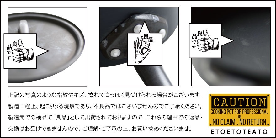 | 取り扱い上の注意 | IH、電子レンジ、オーブン、食器洗い器使用不可。 |