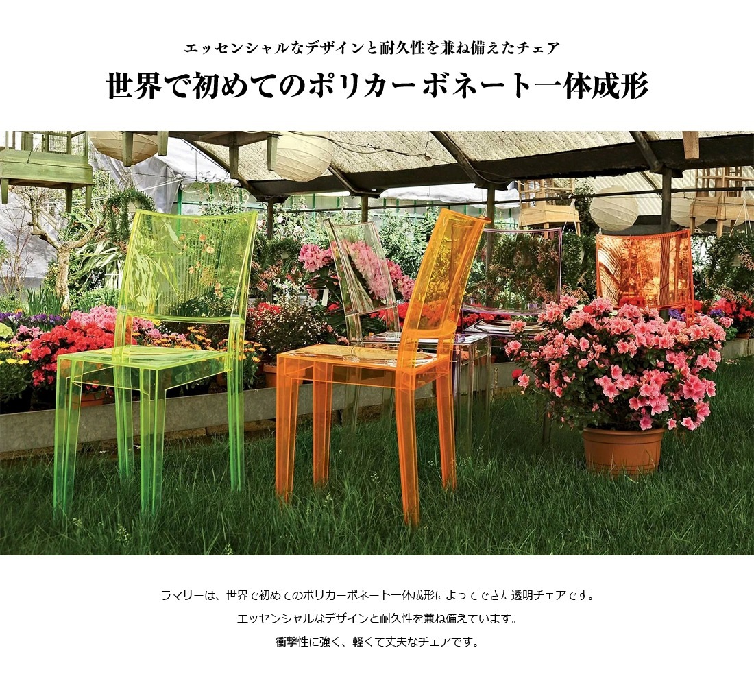 ラマリーは、世界で初めてのポリカーボネート一体成形によってできた透明チェアです。