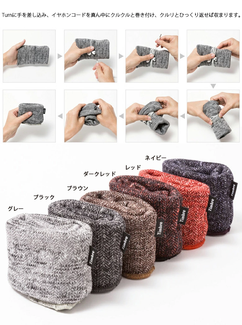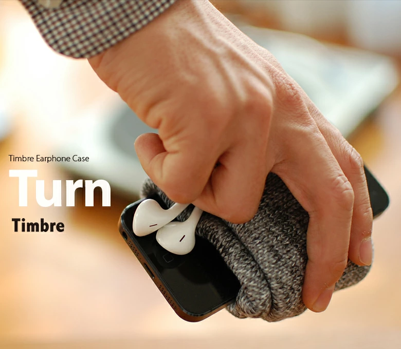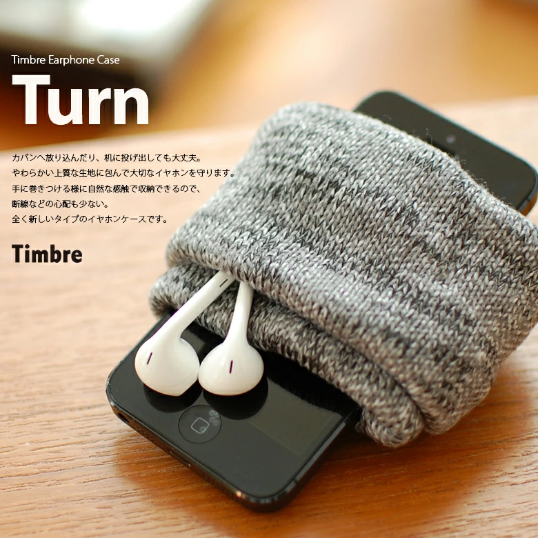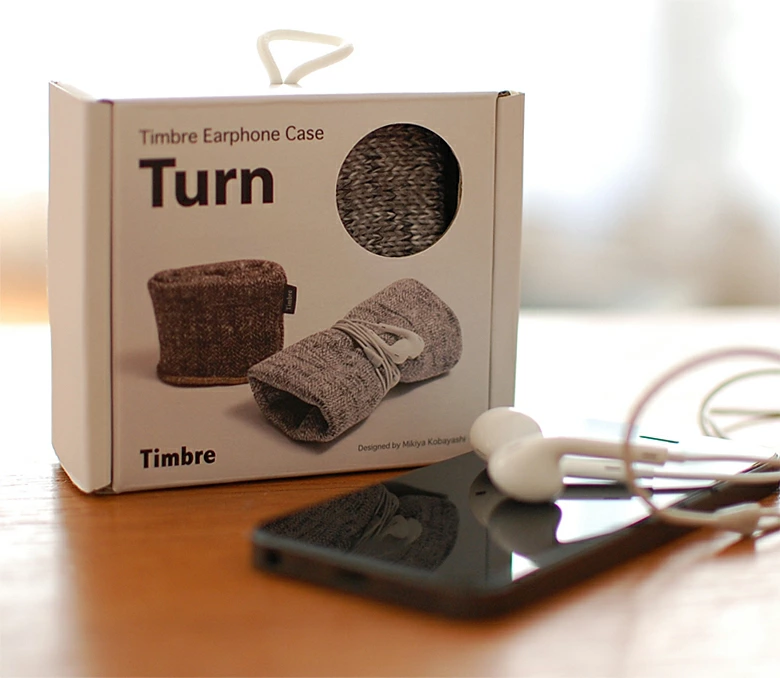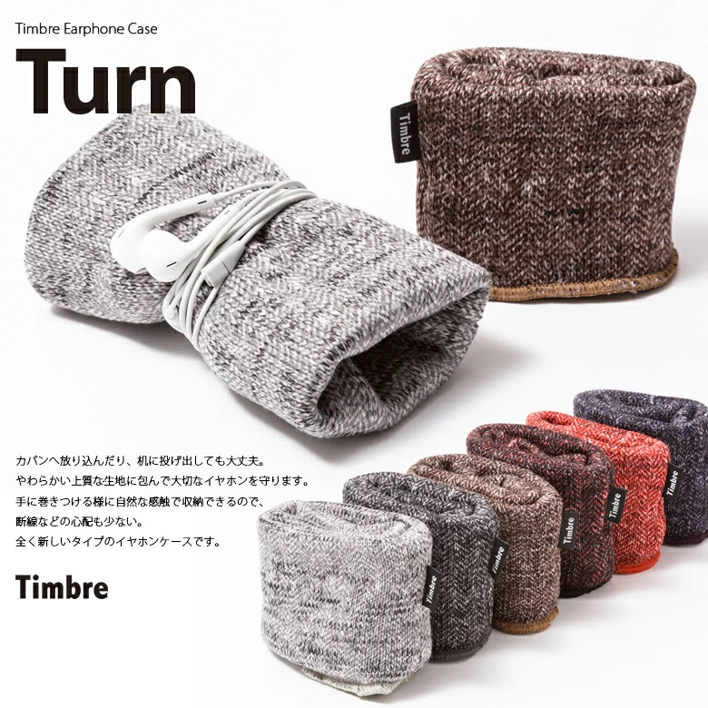使い方は簡単。 中にTimbreタグがある側から、左手を差し込みます。 次に、イヤホンコードを真ん中にクルクルッと巻き付けて、 両手でクルリ!とひっくり返してイヤホンが収まります。 カバンへ放り込んだり机に投げ出しても大丈夫。 やわらかい上質な生地に包んで大切なイヤホンを守ります。 手に巻きつける様に自然な感触で収納できて、断線などの心配も少ない。 全く新しいタイプのイヤホンケースです。 「お気に入りの大切なイヤホンを、簡単にしっかりと収納したい!」 プロジェクトのスタートは、音楽が大好きなTimbre代表のこんな言葉からでした。 イヤホンの収納グッズが色々販売されているものの、「巻き癖がつく」「断線しやすい」「ケースが大げさ」「収納に時間が掛かる」など、使ってみるとどれも私たちが考える理想とは少し違うものばかりでした。 デザイナーの小林さんと、まずはその理想の仕組みとはどんなものかと、幾度もミーティングを重ねてその構造を検討しました。 コンセプトとしては、 巻き癖や断線を防ぐために、手に巻き付けるような感触でやわらかくコードが巻ける。 そこから素早くイヤホンが収納できる。 オーディオ的ではなくソフトな印象で、ファッションアイテムの様に持ち歩ける。 そんなイヤホンケースを目指しました。 当初は、ハードケースやシリコンケースなど色々と素材から検討しましたが、やわらかい印象や手触りからファブリックに辿り着きました。 さらに生地の選定やサイズ、形状などのテストを重ね、ようやくこの「Turn」が完成しました。 国内で行っている丁寧な縫製が、この魅力をしっかりと実現してくれています。 日常の中でさりげなく使って頂くことで、この魅力を感じてもらえたらと思います。