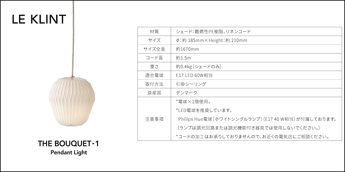 | 注意事項 | *電球×1個使用。 *LED電球を推奨しています。 LED電球[ホワイトシングルランプ] (E17 40 W相当)が付属しております。 *コードの加工はお承りしておりませんので、 お近くの電気店にご相談ください。 |