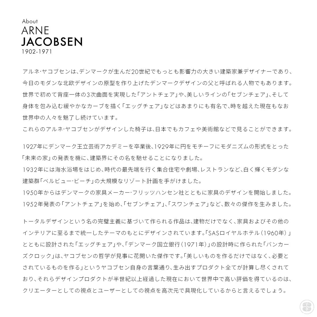| デザイナー | Arne Jacobsen(アルネ・ヤコブセン)1902年~1971年 デンマーク出身。建築家兼デザイナー。 デンマークデザインの父と呼ばれている。 「アントチェア」「セブンチェア」「エッグチェア」などは あまりにも有名で時を越えた現在も世界中の人々を魅了している。 |