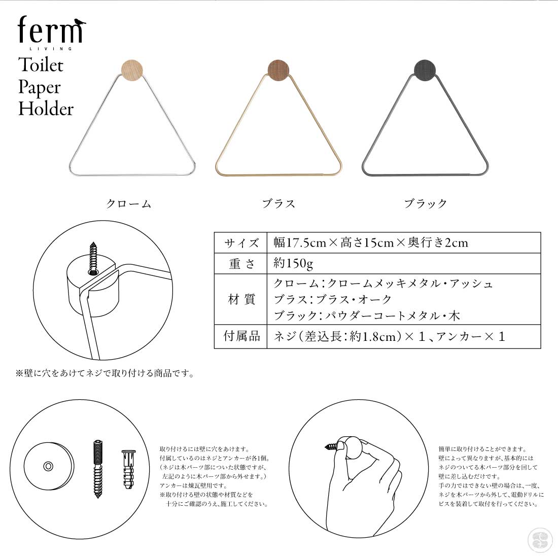 | 注意事項 | ※壁に穴をあけてネジで取り付ける商品です。