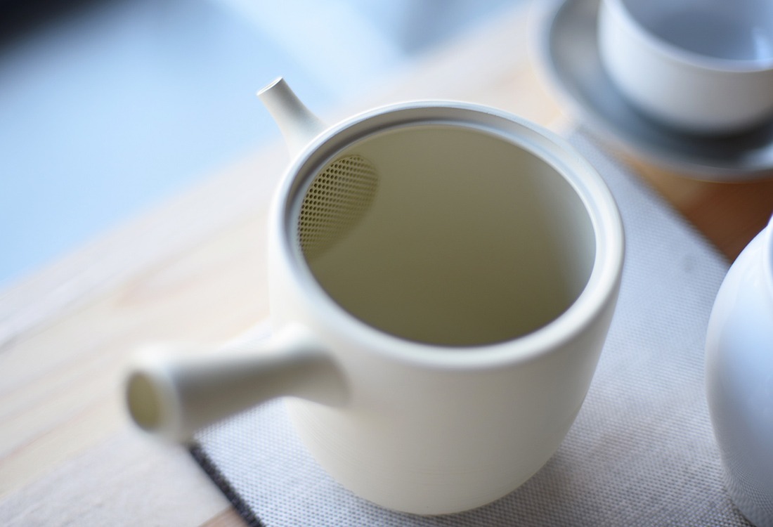 精密な陶製の茶漉しでお茶を最後まで注ぎ切り、
