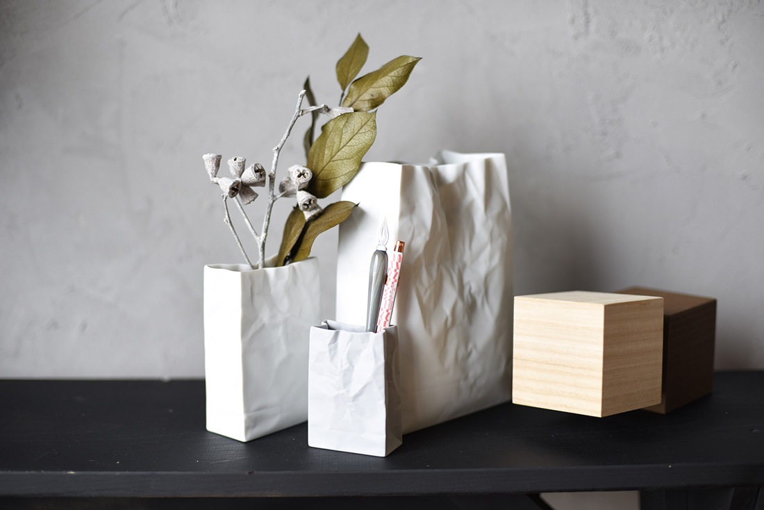 紙袋の形を磁器で表現したユニークな花瓶