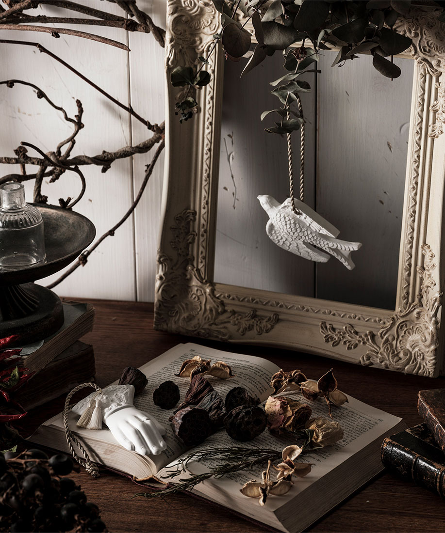 設立以来、すべて東京のアトリエにおいて独自の技術で制作される石膏のアロマオーナメント