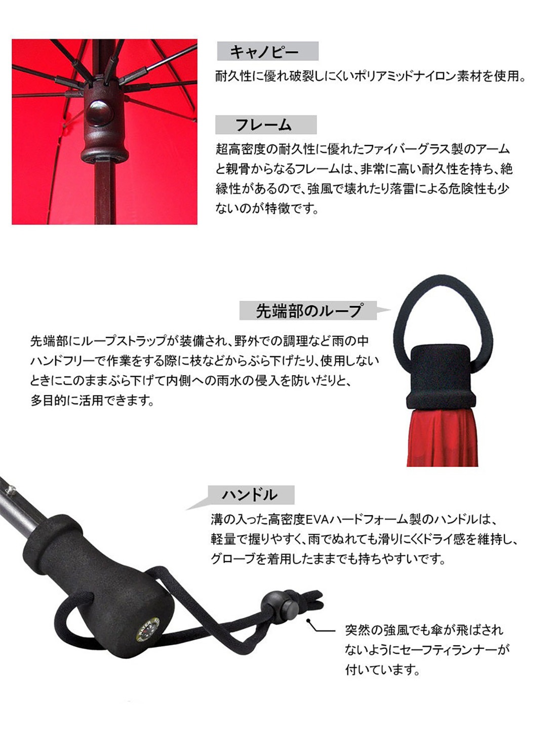 ●キャノピー:耐久性に優れ破裂しにくいポリアミッドナイロン素材を使用。