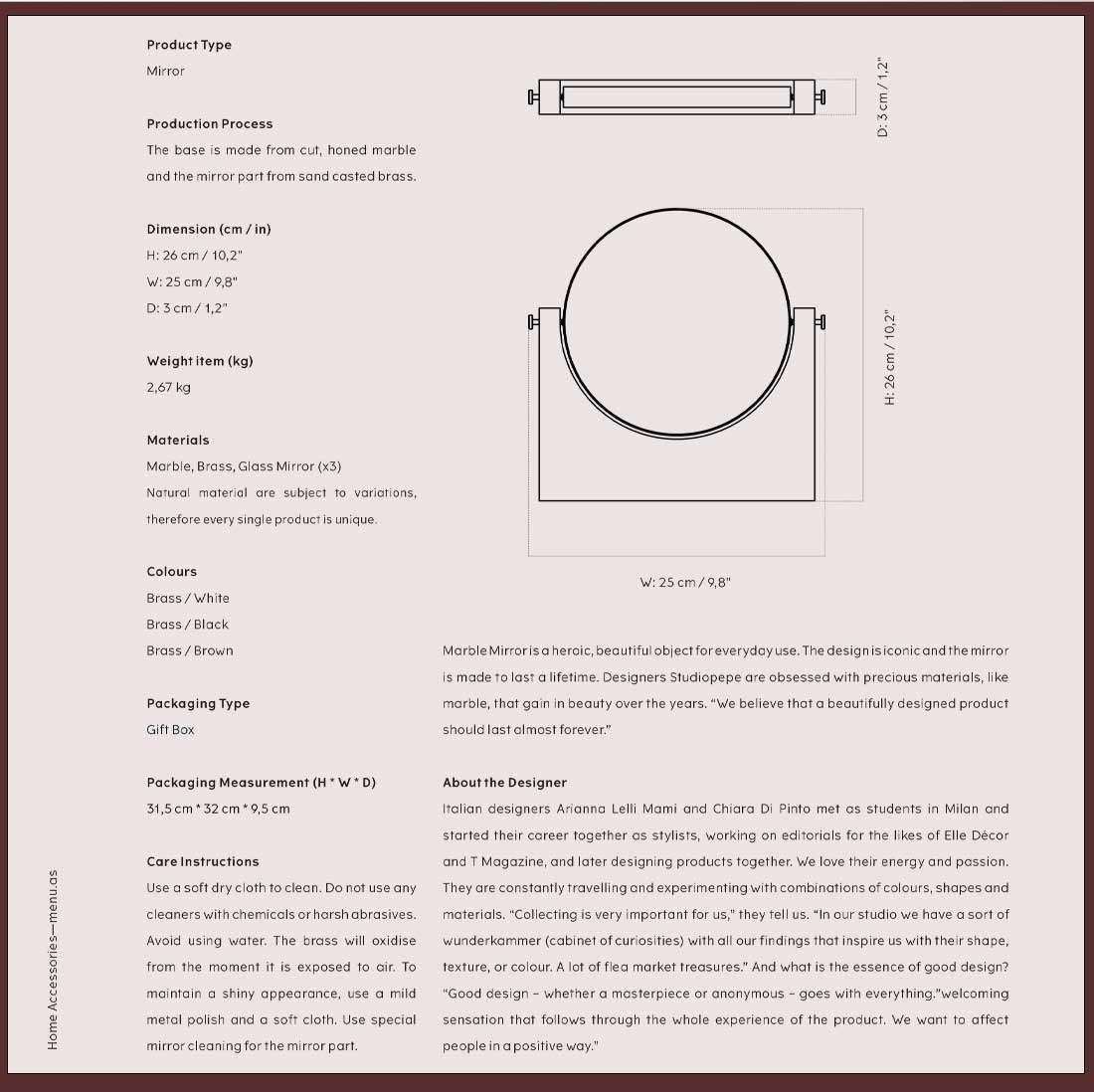 ぺぺ マーブルミラー 大理石を用いてシンプルかつ贅沢にデザインされた卓上ミラー。毎日覗く場所だからこそ、美しくデザインされた製品を。デザイナーの信念が込められたプロダクトです。 Designer Studiopepe / スタジオペペは、インテリアデザイナーのArianna Lelli MamiとインテリアスタイリストのChiara Di Pintoによって、2006年にミラノに設立されたデザイン事務所です。ショップやホテルからプライベートスペースまで幅広いインテリアデザインや製品デザインおよびクリエイティブコンサルティングを含む分野で、学際的なアプローチによるデザインとリサーチを重点的に活動。各クライアントの個性を尊重したデザインによる解決策を提供しています。カッシーナ、B&Bイタリア、カルテル、フリッツ・ハンセン、メニューなど、様々なブランドの家具デザインも手掛けています。